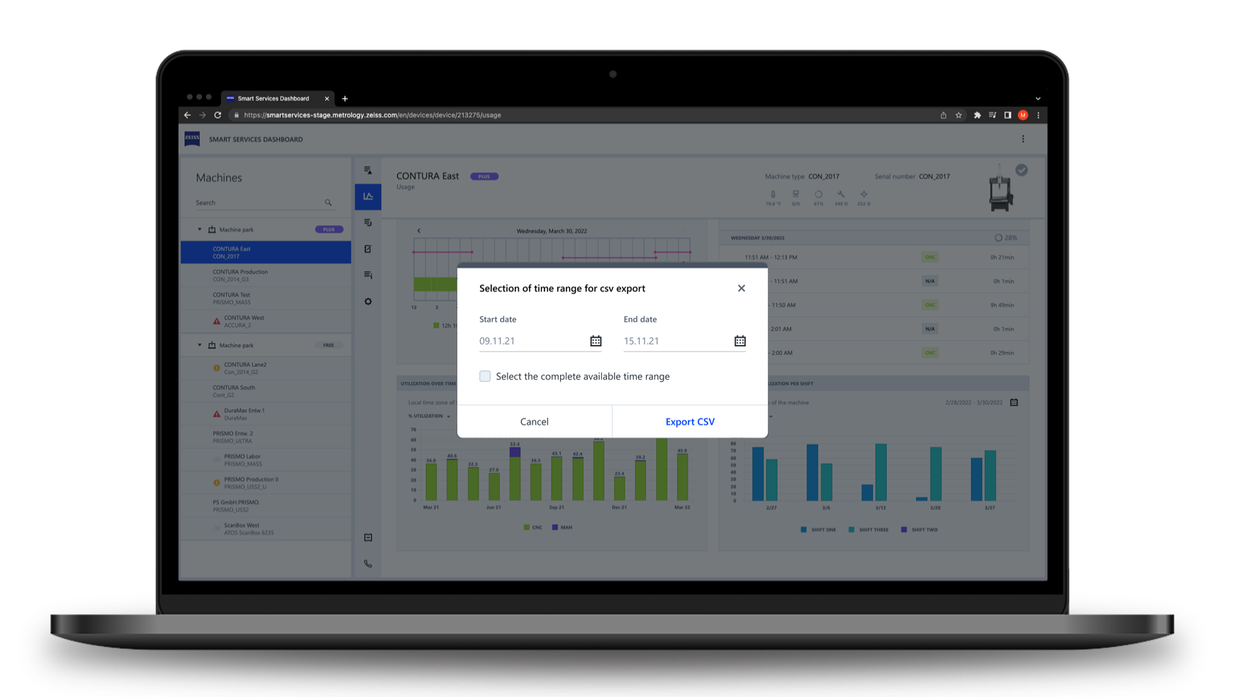 Želite li izvršiti daljnje analize i trebate podatke iz ZEISS Smart Services Dashboard PLUS? Nova funkcija izvoza omogućuje jednostavno preuzimanje širokog spektra strojnih podataka u formatu csv. Na taj način možete jednostavno filtrirati podatke koji su za vas vrijedni i zanimljivi te provoditi analize i procjene specifične za korisnika u odnosu na iskorištenje, korištenje, kolizije, planove mjerenja ili temperature u odgovarajućoj bazi podataka.